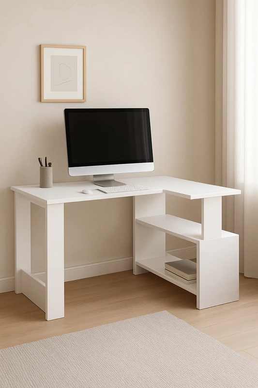 עמדת עבודה פינתית | ציר פתיחה וסגירה לחסכון במקום | 2 מדפים לאחסון ספרים וציוד נלווה |