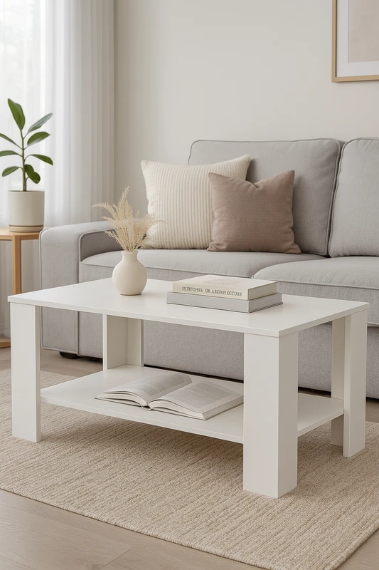 שולחן לסלון בעל מראה מודרני | מדף תחתון לעתונים ספרים וציוד נלווה | צבע לבן