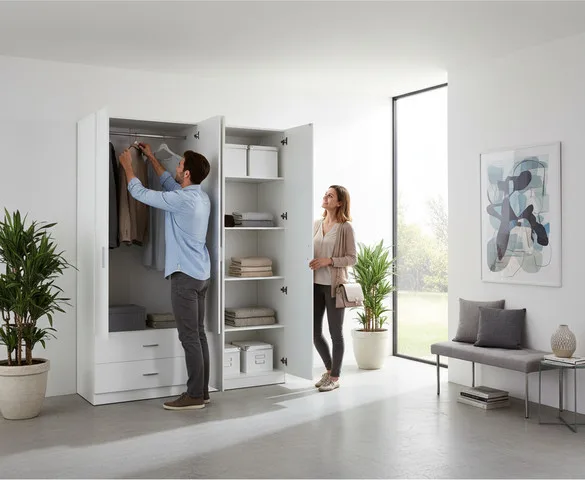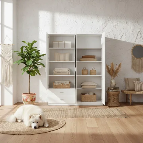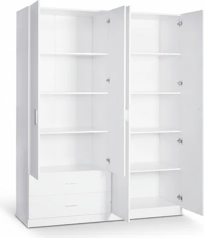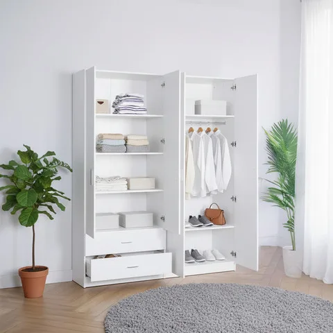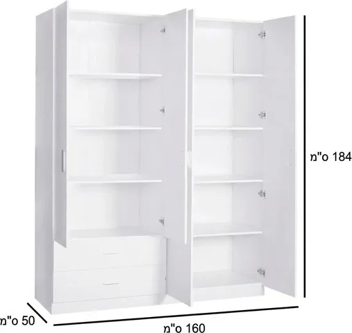 ארון בגדים 4 דלתות | 9 תאים מרווחים | מדפים בלבד | 2 מגירות | מגיע על רגליים למניעת רטיבות | מוט תליה נשלף מתנה