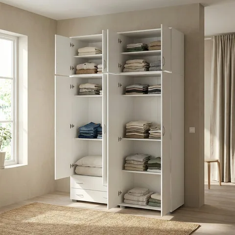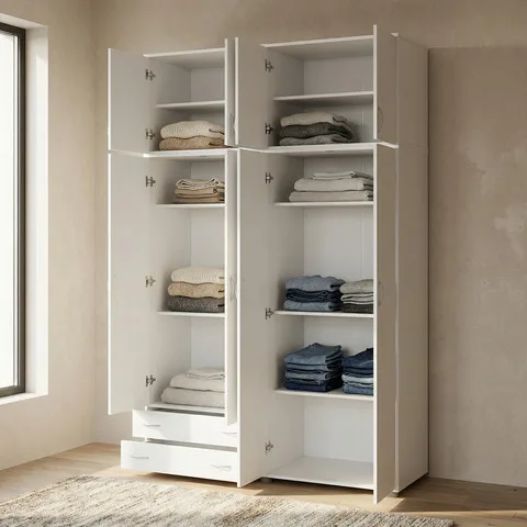 ארון בגדים 4 דלתות גבוה | 11 תאים מרווחים | 2 מגירות | מגיע על רגליים למניעת רטיבות | מוט תליה במתנה