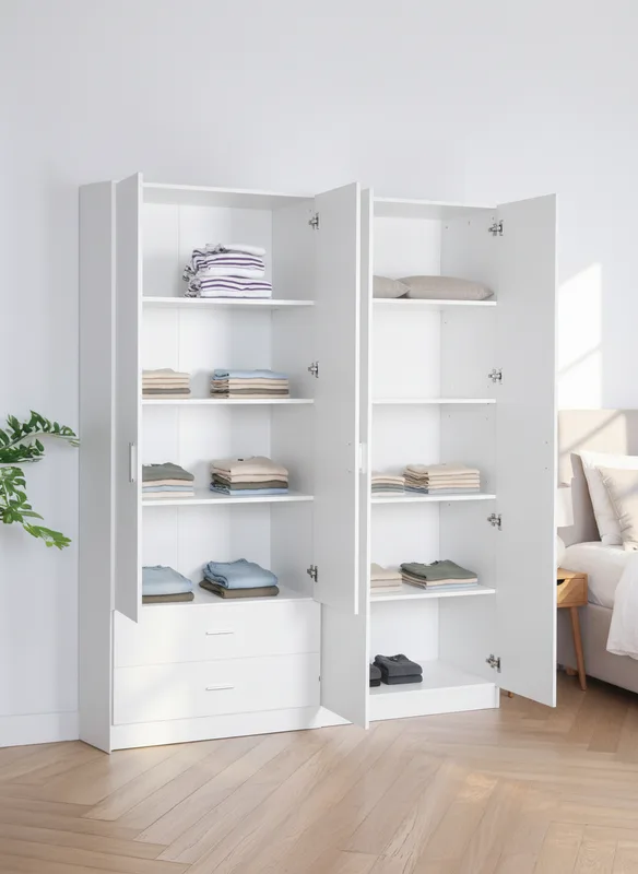 ארון בגדים 4 דלתות | 9 תאים מרווחים | מדפים בלבד | 2 מגירות | מגיע על רגליים למניעת רטיבות | מוט תליה נשלף מתנה